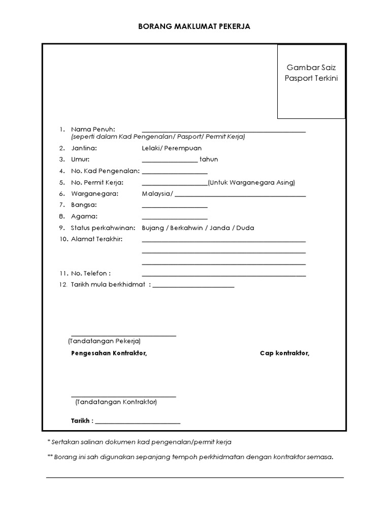 BORANG MAKLUMAT PEKERJA Gambar Saiz Passport Terbaharu 1.